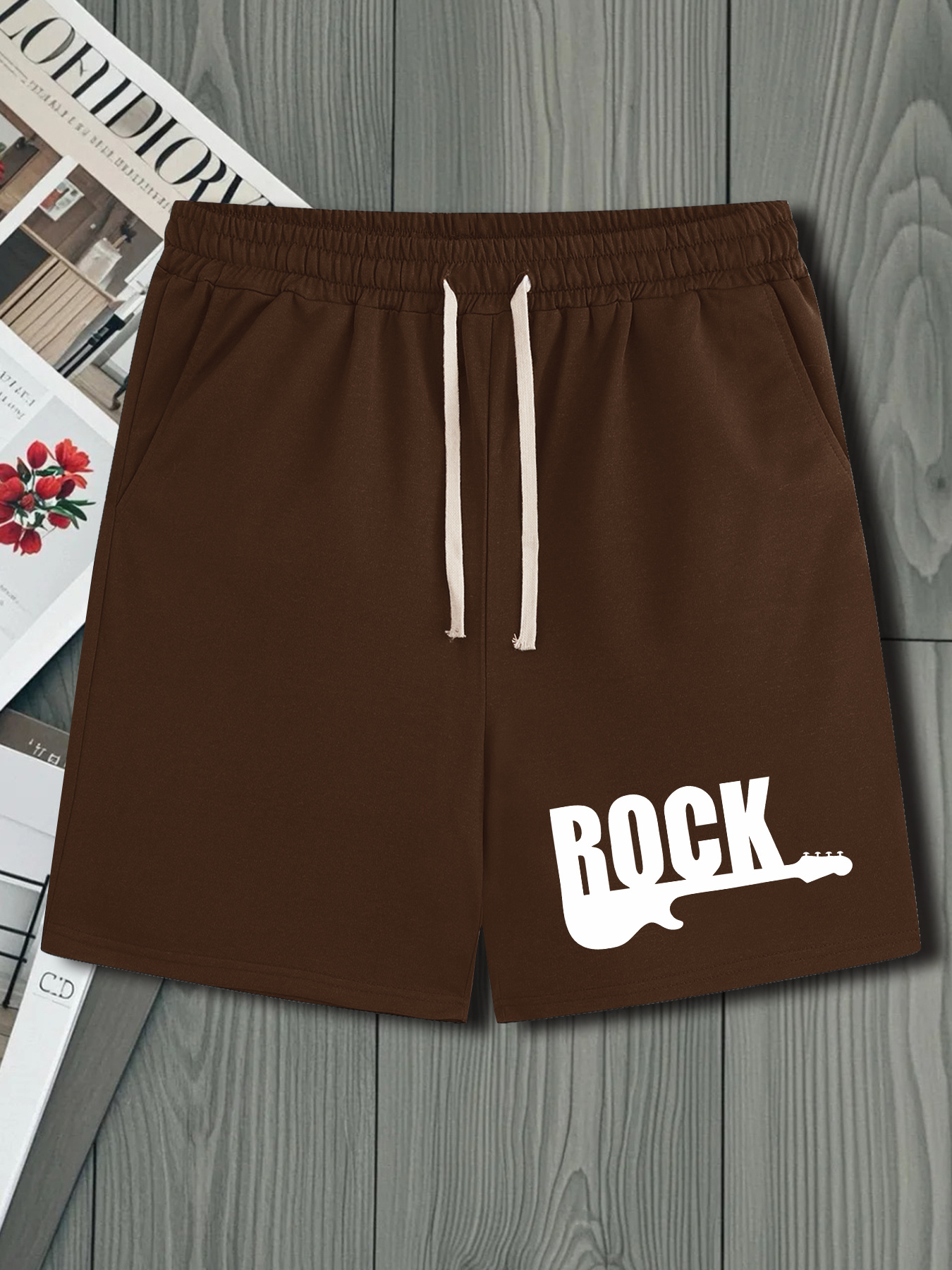 Men's Casual Rock Print Drawstring Shorts - Breathable Polyester, Pockets Included, Machine Washable