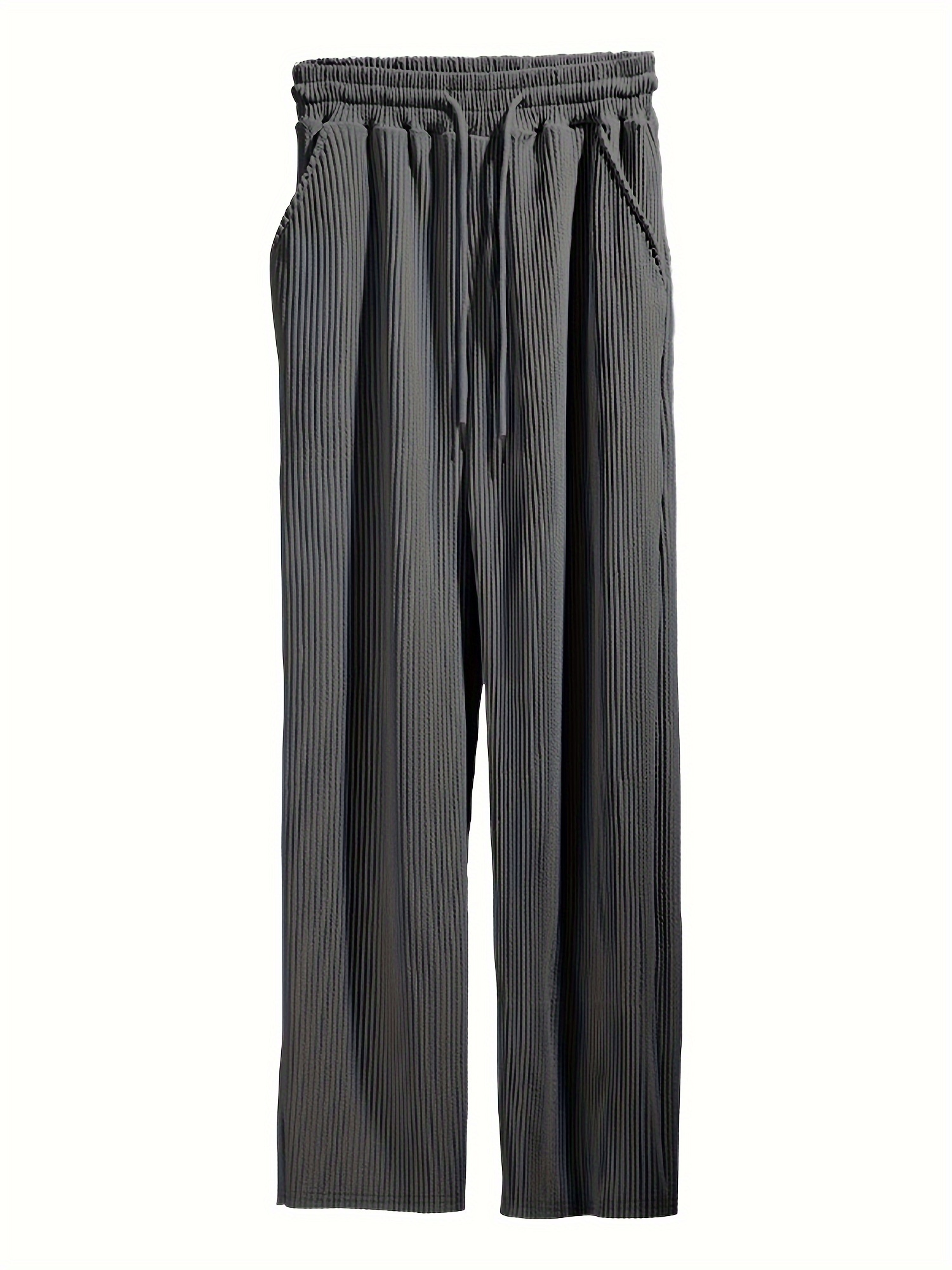 Men's Drawstring Pants Mid Waist Straight Leg Long Pants Casual Solid Color Ribbed Pants