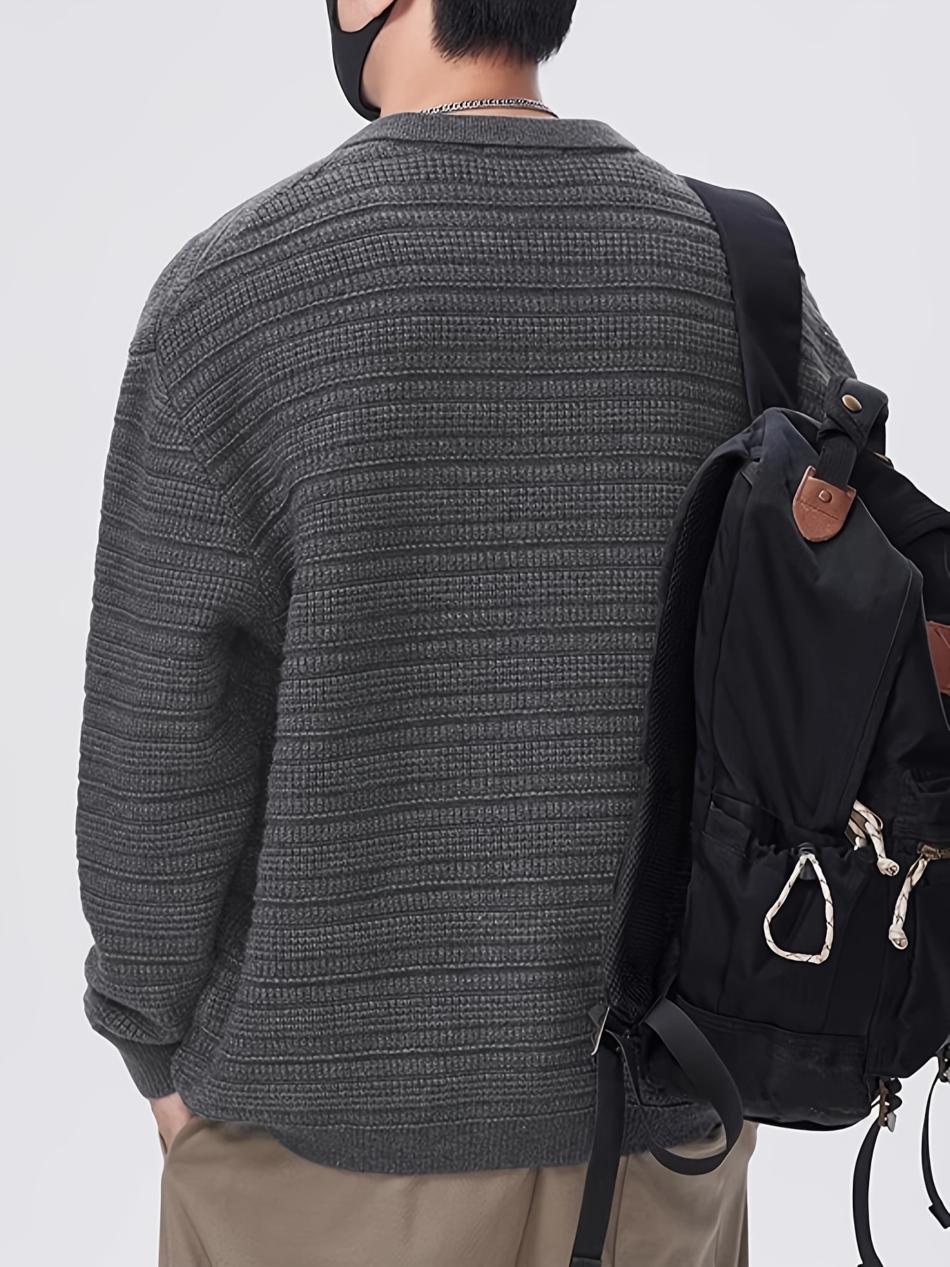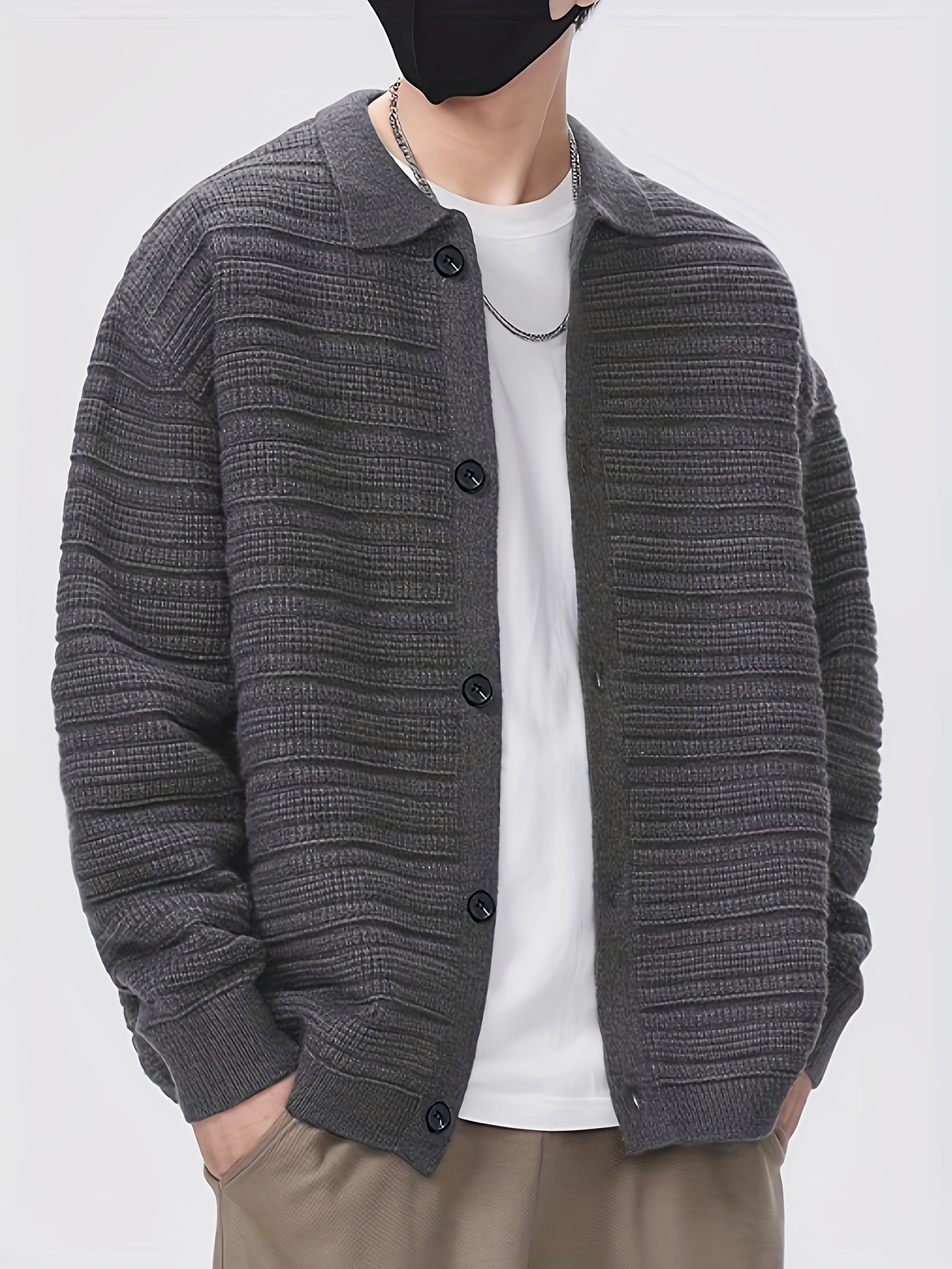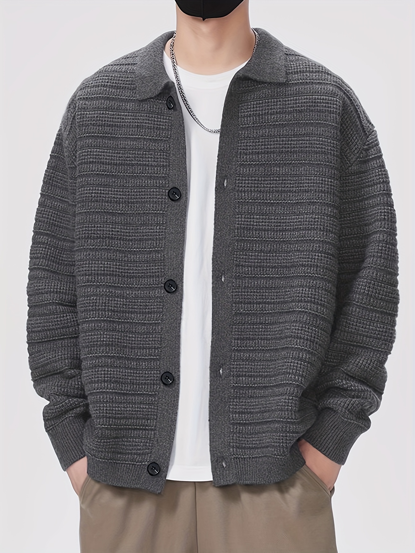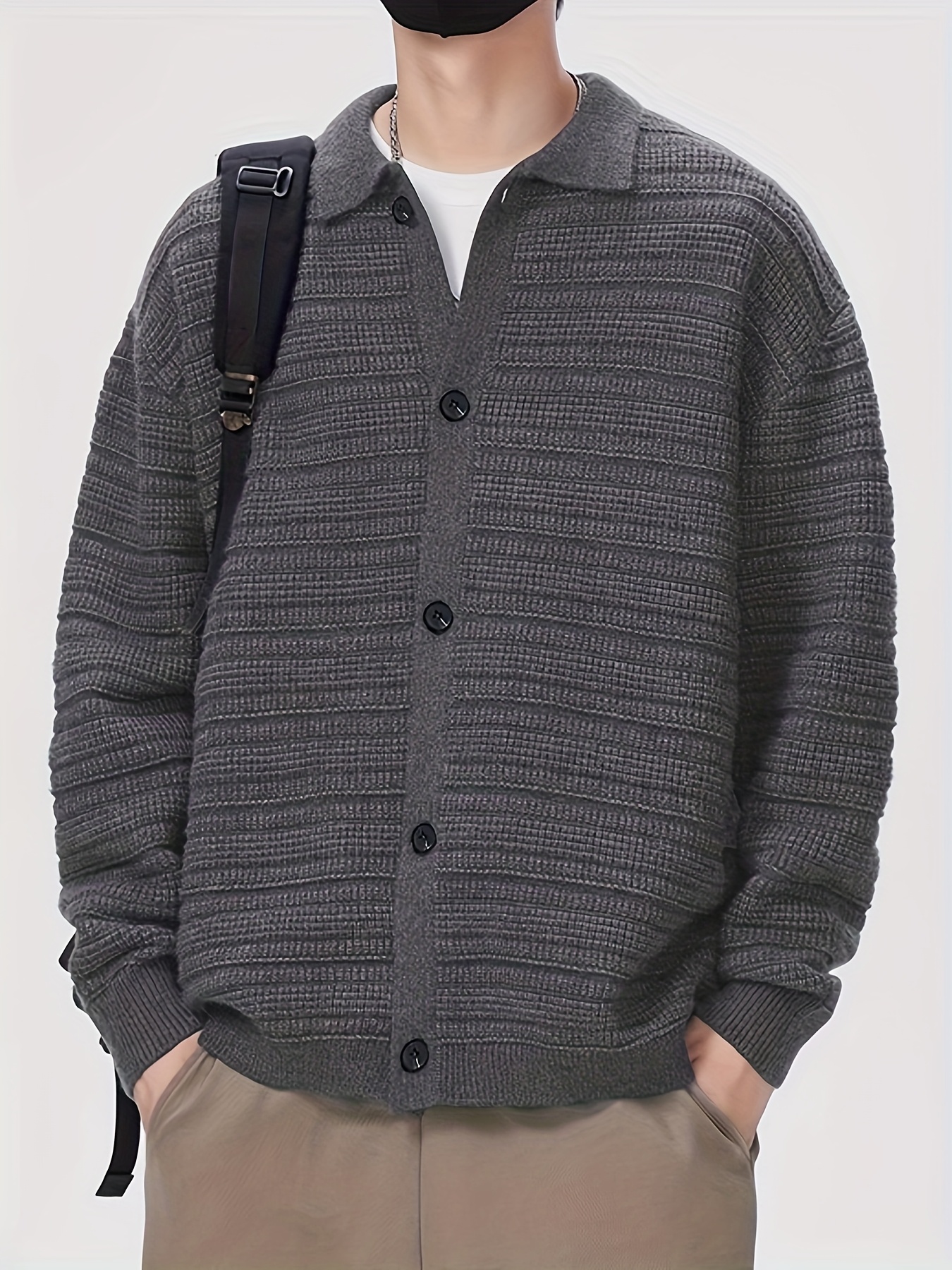 Men'S Fall/Winter Casual Rib-Knit Cardigan, Acrylic Blend, Preppy Style, Loose Fit, Relaxed Shoulder, Long Sleeve, Solid Color, Medium Stretch, Knit Fabric, with Lapel Collar and Open Front for Men