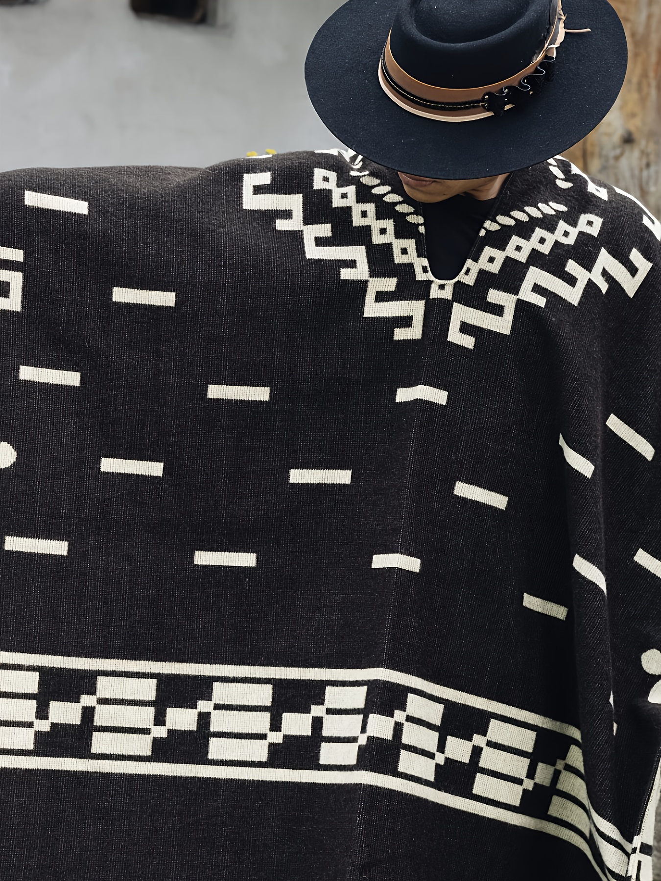 Casual V-Neck Tribal Pattern Poncho with Tassels - Polyester & Acrylic Blend, Non-Stretch Woven Fabric, Fall/Winter Warmth - Western Bandit Inspired Cape for Outdoor Adventures and Shopping